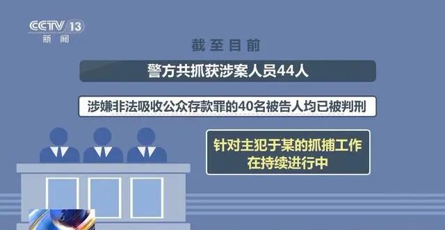 截至目前,警方共抓获涉案人员44人,其中涉嫌非法吸收公众存款罪的40名被告人均已被判刑,针对主犯于某的抓捕工作也在持续进行中。