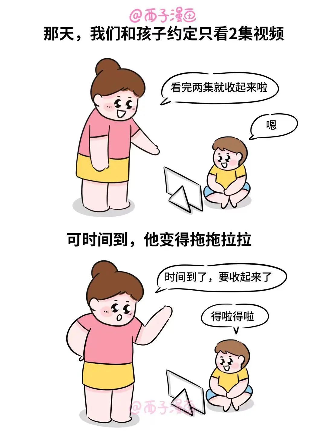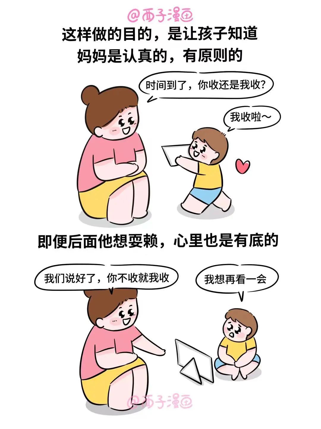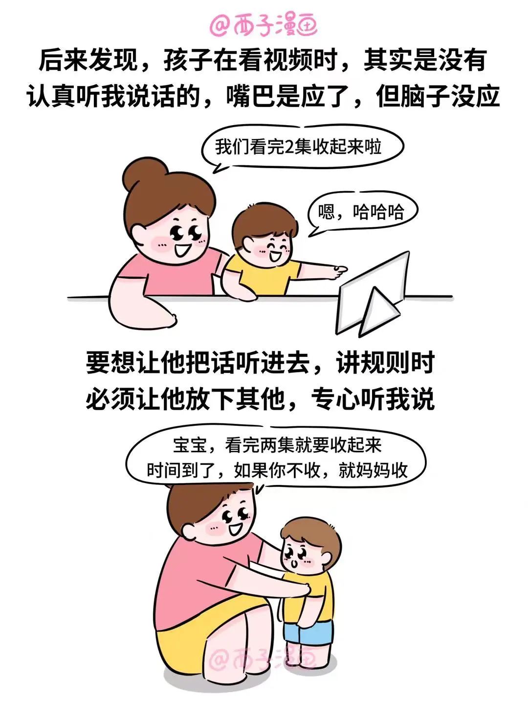 那天,我们和孩子约定只看2集视频,可时间到,他变得拖拖拉拉。我知道他想要挑衅规则了,但我是不允许的,看他依旧无动于衷,我就大声吼了句,他才乖乖收起。可是,难道每次都要这样吼他才听进去吗?为了打破这个恶性循环,我开始努力提升觉察能力。后来发现,孩子在看视频时,并没有认真听我说话,嘴巴是应了,但脑子没应,要想让他把话听进去,讲规则时必须让他放下其他,专心听我说话。这样做的目的,是让孩子知道妈妈是认真的,有原则的,即便后面他想耍赖,心里也是有底的。如果最后他还是哭了,我们要允许他哭泣,给他温和的安抚和陪伴,让他知道妈妈任何时候都是爱他的。守住原则,千万不要因为孩子哭两声就动摇,孩子会误以为原则是可松动的,只要哭一哭就能满足。一旦最后环节心软了,前面的努力就前功尽弃了,只要我们坚持做好,孩子自然就会遵守规则,我们也不用发火。宠粉福利来啦