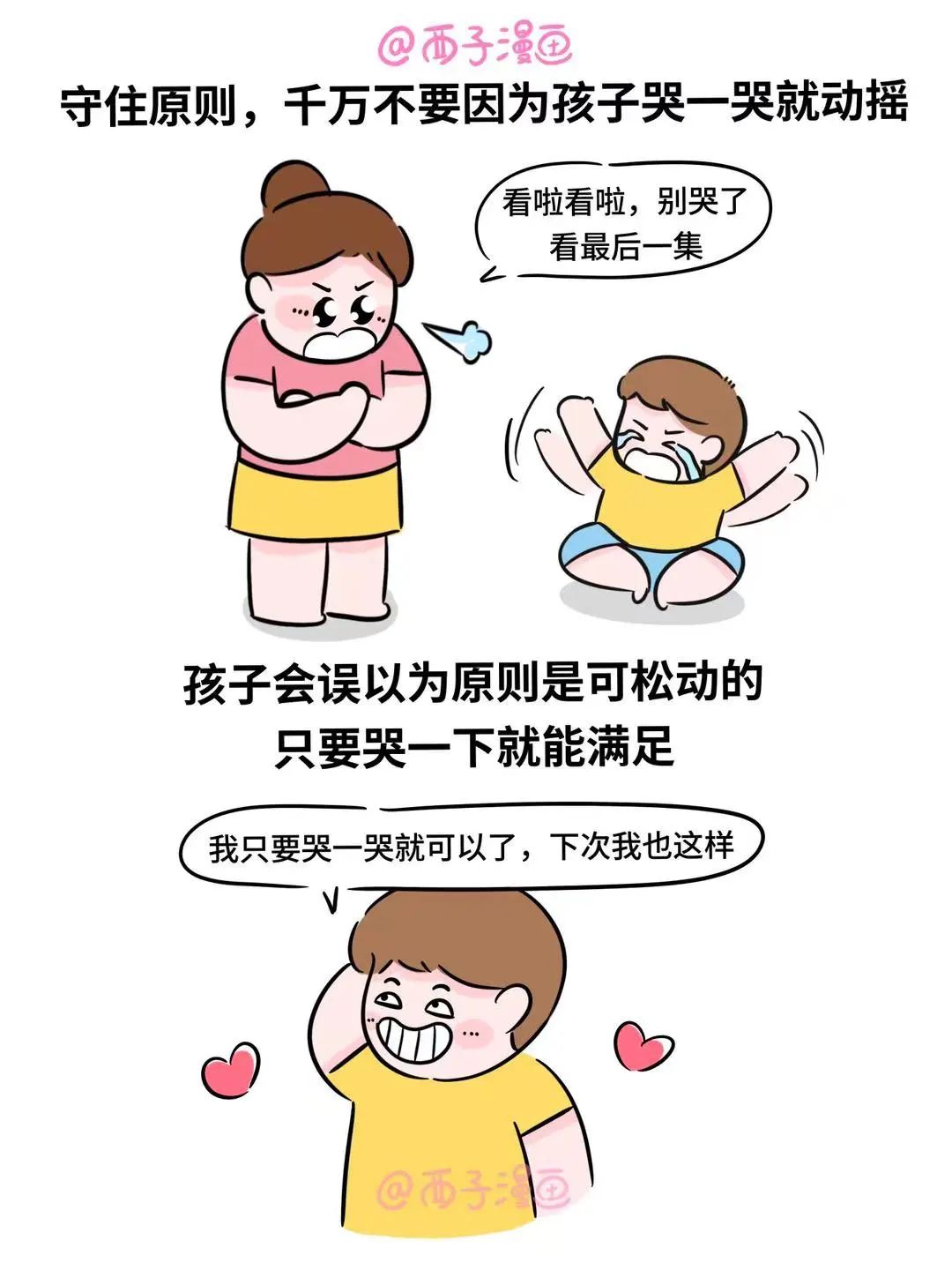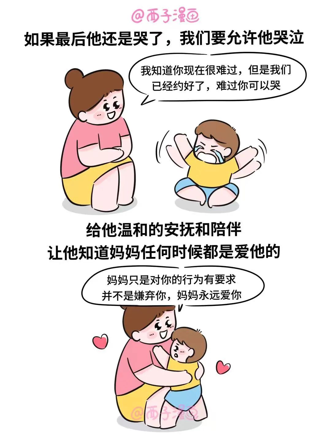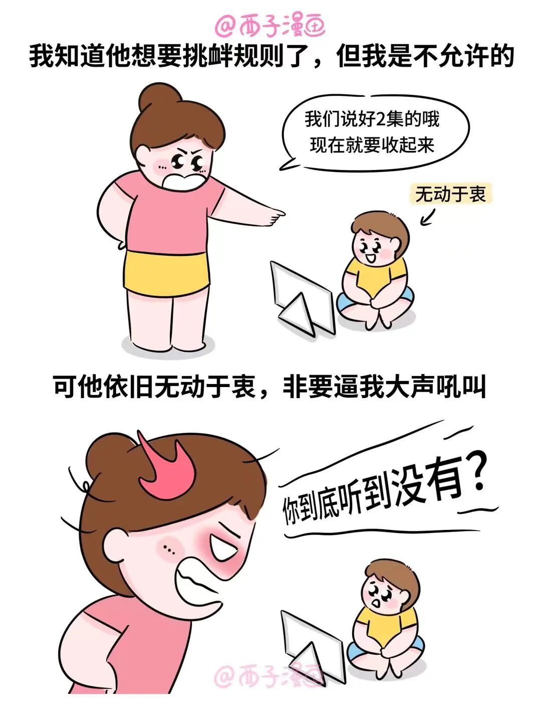 那天,我们和孩子约定只看2集视频,可时间到,他变得拖拖拉拉。我知道他想要挑衅规则了,但我是不允许的,看他依旧无动于衷,我就大声吼了句,他才乖乖收起。可是,难道每次都要这样吼他才听进去吗?为了打破这个恶性循环,我开始努力提升觉察能力。后来发现,孩子在看视频时,并没有认真听我说话,嘴巴是应了,但脑子没应,要想让他把话听进去,讲规则时必须让他放下其他,专心听我说话。这样做的目的,是让孩子知道妈妈是认真的,有原则的,即便后面他想耍赖,心里也是有底的。如果最后他还是哭了,我们要允许他哭泣,给他温和的安抚和陪伴,让他知道妈妈任何时候都是爱他的。守住原则,千万不要因为孩子哭两声就动摇,孩子会误以为原则是可松动的,只要哭一哭就能满足。一旦最后环节心软了,前面的努力就前功尽弃了,只要我们坚持做好,孩子自然就会遵守规则,我们也不用发火。宠粉福利来啦