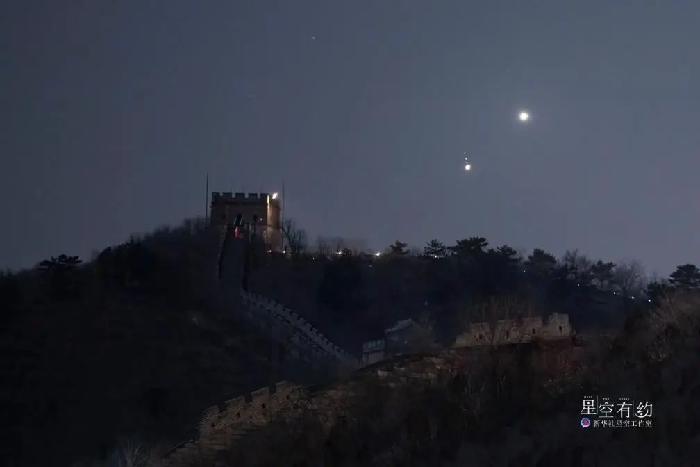 这是2023年3月2日在北京怀柔区水长城拍摄的金(右上)木(左下)极近。(北京星空摄影爱好者周博 摄)“本次相合发生在23日17时左右,二者之间的角距离最近时只有11角分,但正值白天,二者距离太阳过近,不论是用肉眼或望远镜观看,都非常危险,阳光很容易灼伤眼睛。”杨婧提醒说。