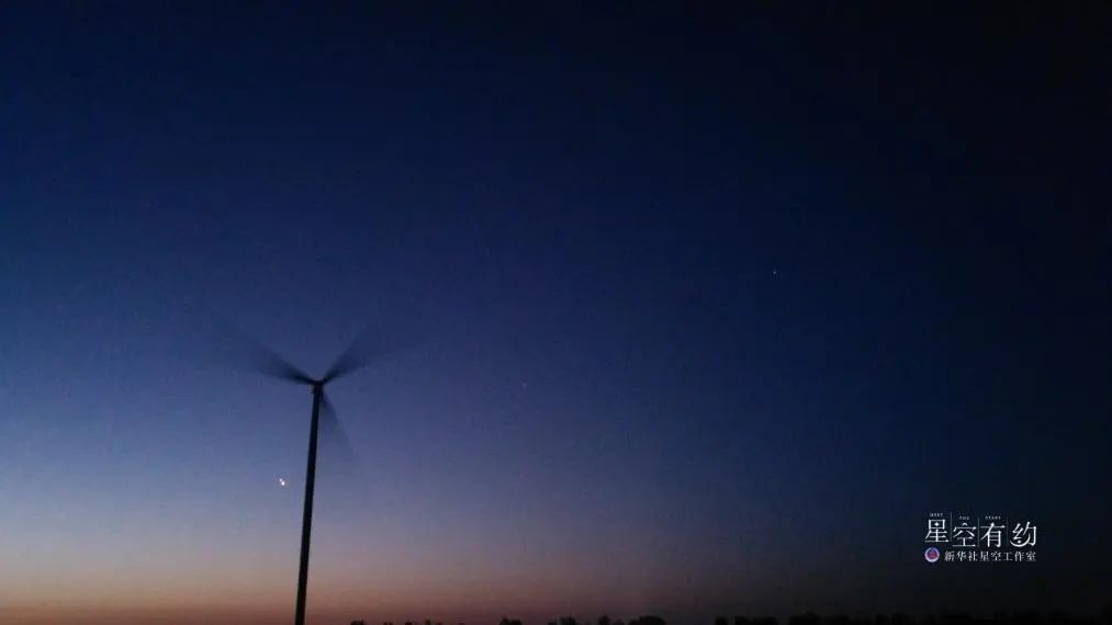 这是2022年5月1日在天津宝坻区拍摄的金(右下)木(左上)极近。(天津星空摄影爱好者马强 摄)太阳落下去后天色渐黑,还可以看到这场“星星相吸”吗?“看不到。这是因为太阳落下去之前,金星和木星已经落到地平线以下了。”杨婧解释说。