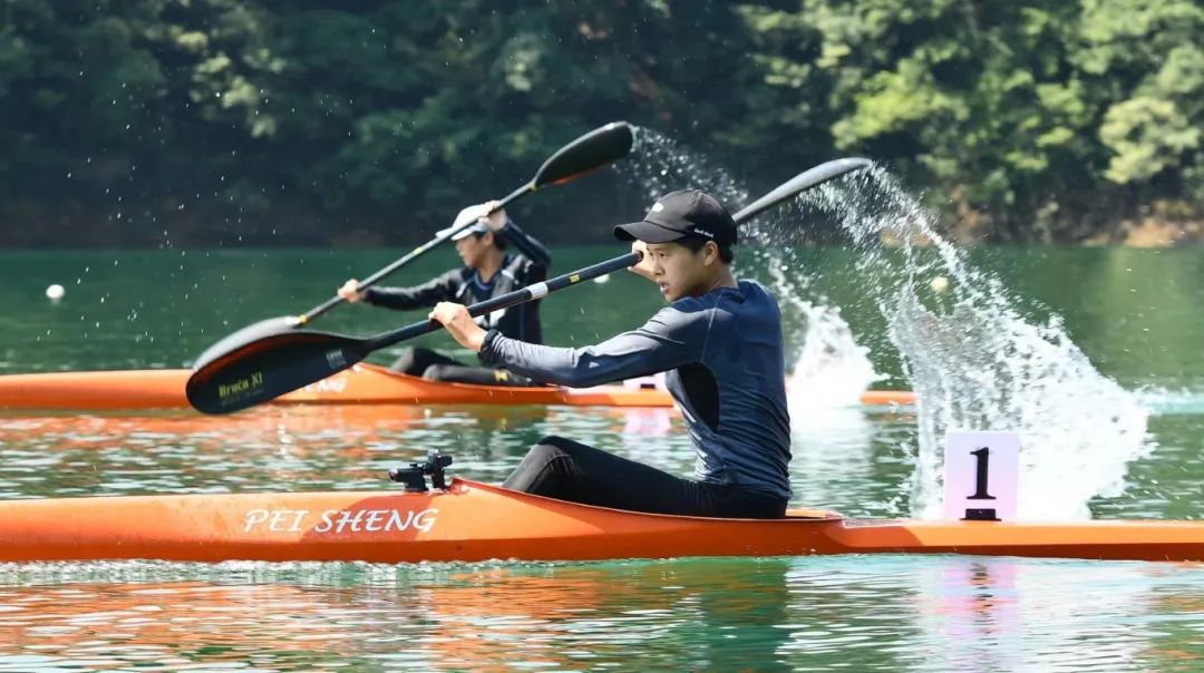左一为陈雨乐湘湖畔,萧山区少体校皮划艇训练基地内,两头尖尖的小船里,一群孩子正挥舞着两端都有着桨叶的皮艇桨,在水面上划过一条条美丽的弧线。