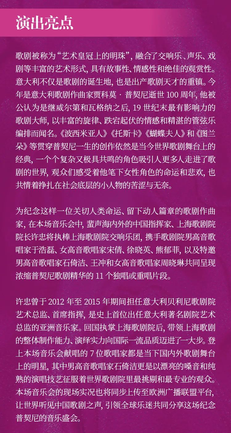 每年辰山草地广播音乐节在曲目的选择上都经过了精心策划,想要为生活在都市里的人们提供一个“有音乐,有自然”的“慢”周末,在户外享受到一场精彩绝伦的音乐盛宴。即将于本周末(5月25日、26日)上演的2024辰山草地广播音乐节同样有着精心考量。第一场“今夜星光灿烂:纪念意大利作曲家普契尼逝世100周年”专场,聚焦意大利歌剧大师普契尼5部歌剧中最为经典的11个唱段,展现中国当代音乐家们的最强歌剧实力。