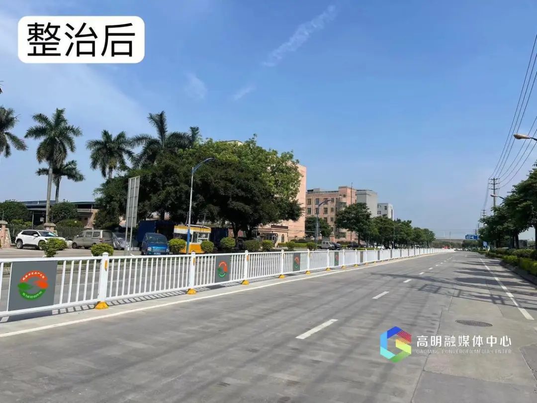 兴明路道路交通整治提升工程整治前后对比图。李玉冰/摄在兴明路(高明大道至三明路段),原先道路中间的“石马”已改造为白色不锈钢分隔护栏,重新安装中央分隔护栏约440米,有效提升了道路的美观性。