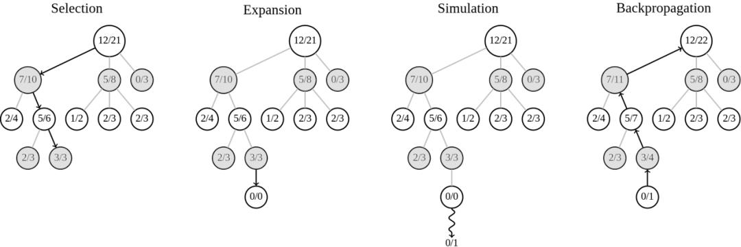 蒙特卡洛树搜索的步骤:选择、扩展、模拟和反向传播,图片来源:Wikipedia @Mciura