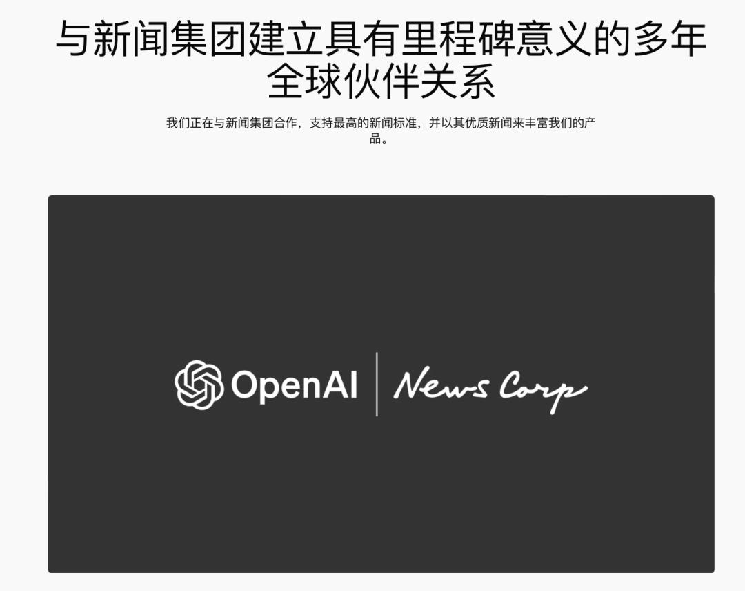 从OpenAI官网发布的合作消息来看,OpenAI有权在ChatGPT中显示新闻集团旗下媒体的内容,来回答用户的问题,增强其产品能力;除了提供内容外,新闻集团还将分享新闻专业知识,以帮助确保在OpenAI的产品中达到最高的新闻标准。