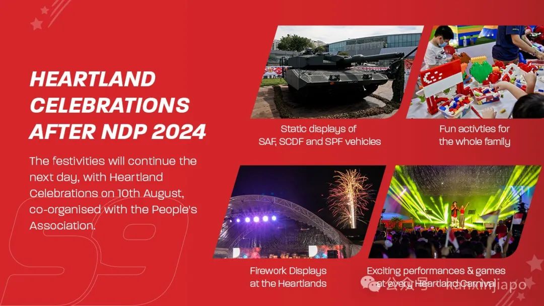图源:2024新加坡国庆官网国庆后的第二天,人们还可以前往五个不同的庆祝地点,观赏社区团体的舞台表演、新加坡武装部队、民防部队和警察部队军车的静态展示、烟花表演以及嘉年华和家庭活动。