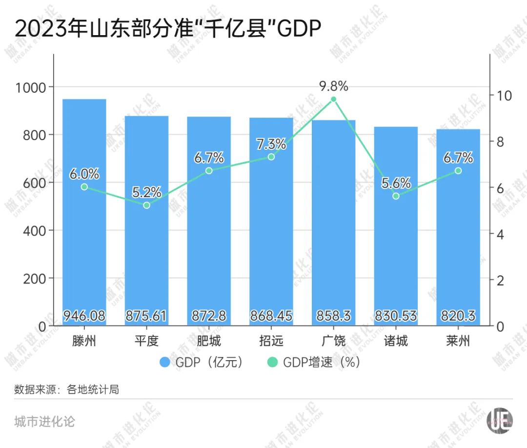相对乐观的是,目前山东有不少县域有望在短期内晋级千亿GDP。其中,滕州2023年GDP为946.08亿元,平度、肥城、招远、广饶、诸城、莱州等多个县(市)GDP均超过800亿元。