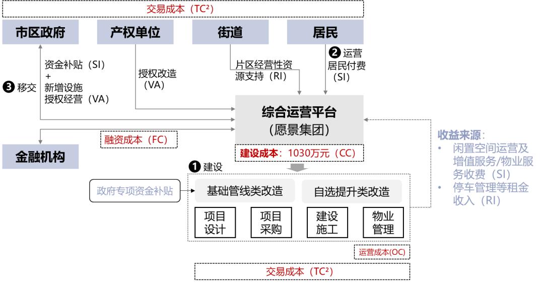 以民企(愿景集团)为代表参与的“综合整治类”老旧小区改造项目,多以与街道、原产权单位合作的形式取得可运营资产。项目根据小区内闲置空间资源的不同,采用BOT或ROT模式,由政府或产权单位赋予社会资本闲置资源经营权,允许其投资、建设、运营小区及周边公益类设施并获取收益。根据介入方式和改造内容的不同,可概括为以财政补贴(SI1)、闲置空间经营(VA)为主的建设收益(CI),以及以物业收费、增值服务提供为主的服务收益(SI2)和以停车收费、片区资源经营为主的租金收入(RI)。