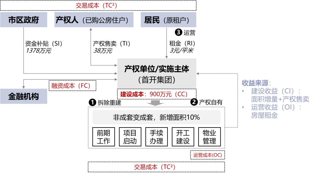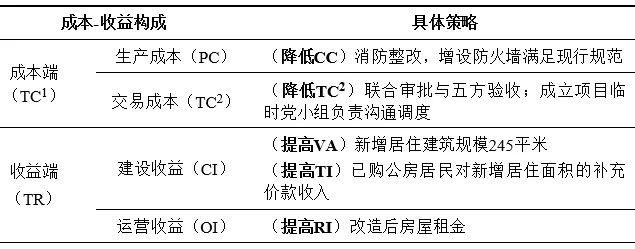 基于“成本—收益”关系优化,首开集团在降低“成本端”的策略主要有(表3):为妥善解决危旧房中历史遗留的合居户问题,方案对日照、绿化等指标进行优化设计,通过消防整改、增设防火墙等方式满足现行规范要求,最大程度降低建设成本(CC);在降低交易成本(TC2)方面,一是在手续办理及施工阶段,规划审批手续办理与改移管线、预留接口等同步推进,并在项目建成后组织五方验收,有效缩短施工周期及验收程序,为社会资本降低项目实施阶段的审批、协商等成本;二是通过成立临时党小组,在沟通居民业主诉求、解危安置等一系列工作中降低沟通协商成本。提高“收益端”的主要策略有:允许危旧楼拆除重建适当增加室内居住面积245平米,并通过将新增面积的产权出售给居民,以此增加社会资本的建设收益(CI);而对于原有承租居民,继续以房屋出租的形式获取部分运营收益(OI)。