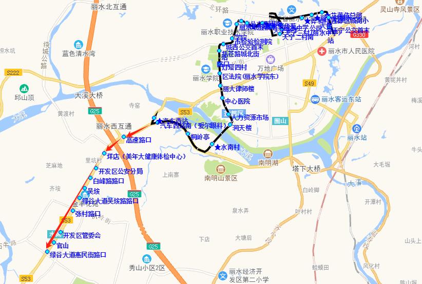 起点站天宁公交首末站-东地路-北环路-紫金路-城北街-清远街-中山街-括苍路-南环路-绿谷大道-终点站丽水职业技术学院(绿谷校区)(返程相同)。