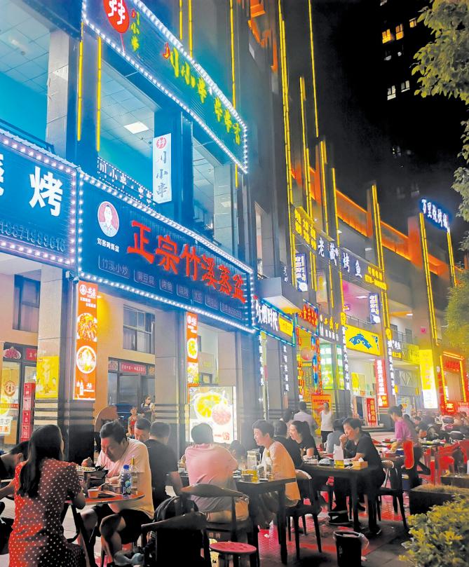 这里是六堰商圈最繁华的餐饮一条街。哪怕到深夜,这里热闹依旧。霓虹灯闪烁着醉人的光芒,照亮了夜市的每一个角落。热气腾腾的小龙虾一盆接一盆地被端上桌,加菜的催促声此起彼伏,每一张桌前,都是一天中最放松时的人们的笑脸。