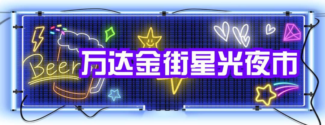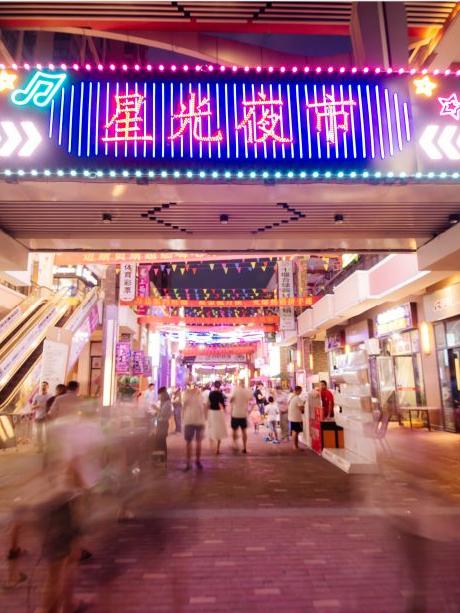 星光夜市,景如其名。当夜色挤走白天的矜持,万达金街进入五彩斑斓的夜生活。密集的店铺和小吃摊上的霓虹灯汇聚成一片星河,将整条街道装点得如梦如幻。