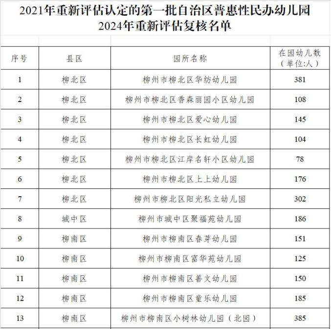5月28日,柳州市教育局发布《关于2024年柳州市普惠性民办幼儿园暨自治区普惠性民办幼儿园市级评估结果的公示》及《关于对2021年新认定及2021年重新认定的第一、二批、第五批自治区普惠性民办幼儿园开展2024年重新评估认定结果的公示》,根据相关通知,经幼儿园申报、县区(新区)教育行政部门认定,市教育局复核,现将复核通过的20所柳州市普惠性民办幼儿园暨自治区普惠性民办幼儿园和92所自治区普惠性民办幼儿园名单予以公示。