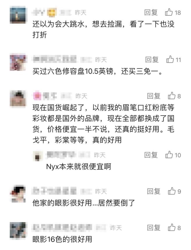 听到NYX的撤店消息,消费者白女士(化名)表示有些惋惜。“NYX的遮瑕棒和眼影好用,但很多眼影盘和粉底的配色更适合欧美妆。另外他们是平价彩妆,现在国货彩妆起来了,营销也比NYX厉害,大家想买平价彩妆的话可能会去选国货品牌。”不少网友也有同样感慨
