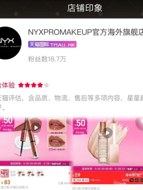 2019年在天猫国际开设了官方海外旗舰店。2021年618,NYX曾拿下天猫国际直营彩妆品牌销量第一,王牌产品16色眼影盘、6色遮瑕盘,定妆喷雾均拿下天猫国际类目榜第一。即便是到了5月28日,NYX的40色眼影盘及多巴胺眼影盘也在近7日的天猫进口眼影热销榜中排名前二。