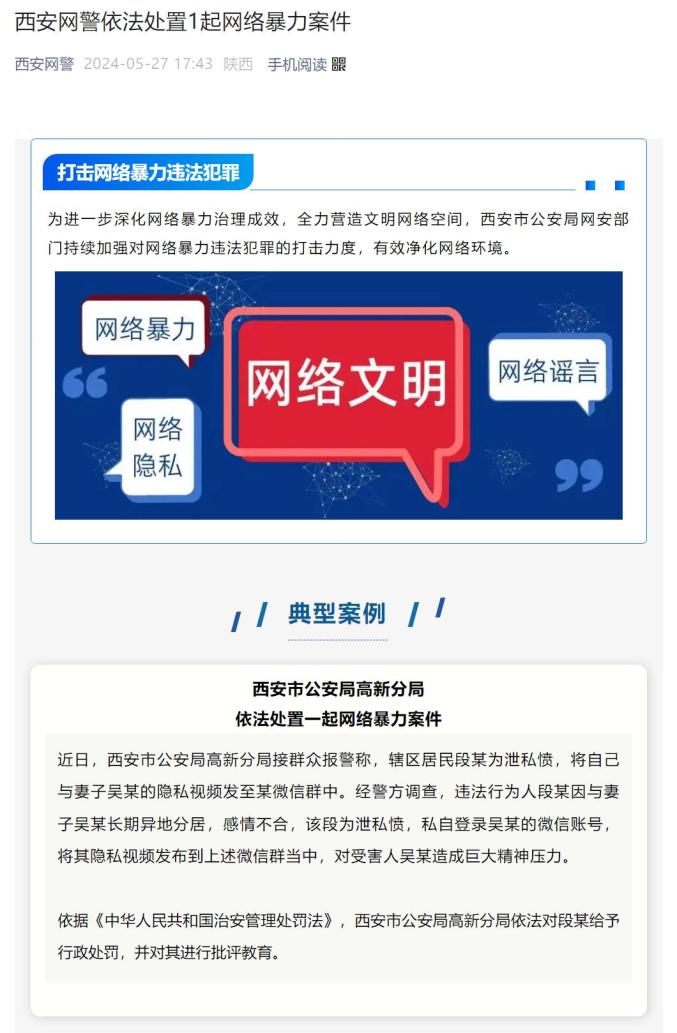2024年3月22日,西安市公安局经开分局通报称,一男子在单位微信工作群内网暴前女友,将自己曾经拍摄的与女同事亲密视频发送至单位微信工作群中,该群有成员近百人,给受害人心灵造成了极大伤害,造成极其恶劣影响。后续,该男子已被西安经开公安刑事拘留。
