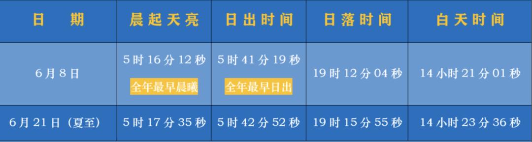 世界各地全年日出最早的日期是因地而异的。在北半球,通常是低纬度(南方)地区比高纬度(北方)地区早一些到来。日出全年最早,在北纬10°地区,出现于5月31日前后;在北纬30°地区,出现于6月12日前后;在北纬50°地区,出现于6月17日前后。如当日天气晴朗