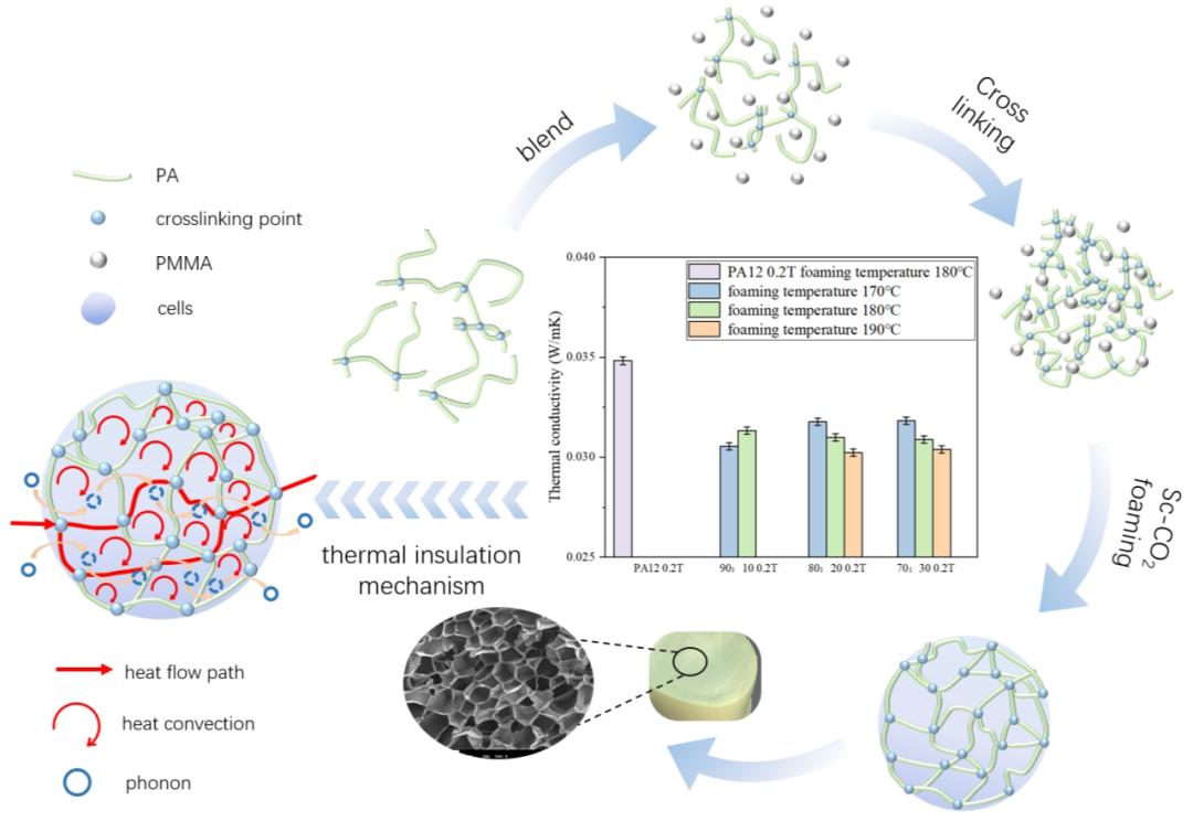 在全球节约能源、减少温室效应和确保安全性的背景下,聚合物发泡材料因其能降低热量损失而受到广泛关注。发泡材料通过引入低导热系数的空气使泡沫具有较低的密度和较好的保温性能,在航空航天、建筑、汽车等行业得到了广泛的应用,但低导热系数伴随的低密度和随之产生的低收缩往往是两个互相矛盾的性能。