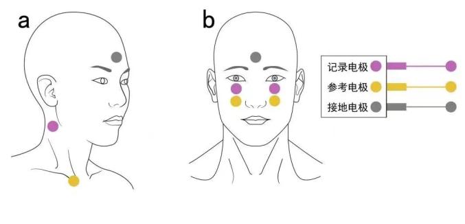 电极位置:记录电极置于双侧眼眶下缘瞳孔中线下方约1cm处,参考电极置于记录电极下方约1~2cm,接地电极置于前额或颏部,极间电阻≤5kΩ。(图2b)。