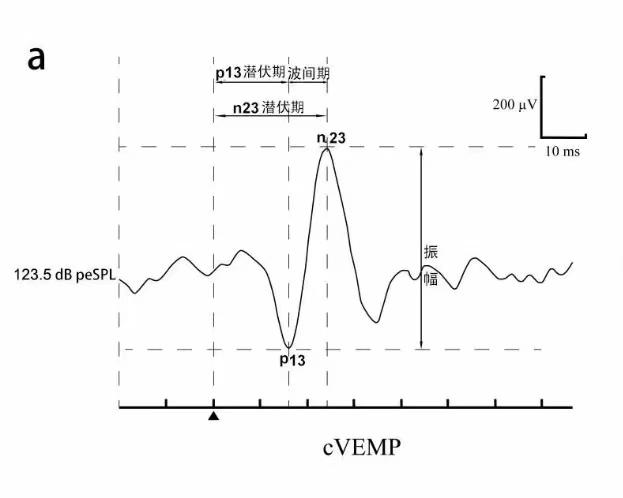 潜伏期对于波形的识别有重要意义。特定刺激强度下,在特定的潜伏期出现典型的波形认为VEMP存在;在特定刺激强度下重复记录3次,波形难以辨认或重复性差,则判定为VEMP未引出。小写字母p和n表示了VEMP波形的极性和非神经起源,阿拉伯数字13、23和10、15分别表示了该波的潜伏期。