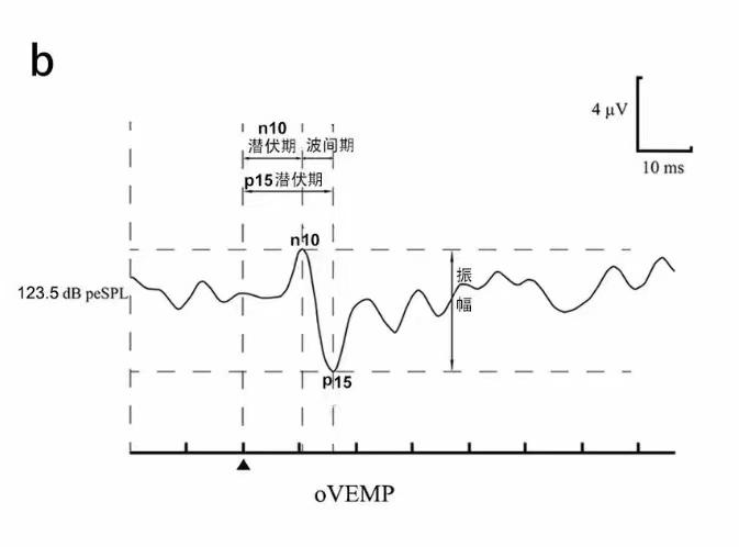 oVEMP波形判定:典型的oVEMP波形为刺激开始后,在潜伏期约10ms出现一个波峰向上的负波(标记为n10),之后在潜伏期约15ms出现一个波峰向下的正波(标记为p15)(图3b)。