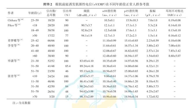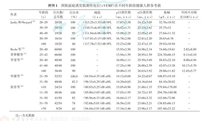 建议各单位建立各自实验室的正常参考值。正常参考值会受到年龄、性别、种族、记录设备和参数设定等因素的影响,建立正常参考值时应考虑到这些因素。不同年龄段或性别的正常人群参考值可分别描述。另外,60岁以上人群VEMP的引出率明显下降,判读时应注意。既往文献中VEMP在人群中的正常参考值见附件1。