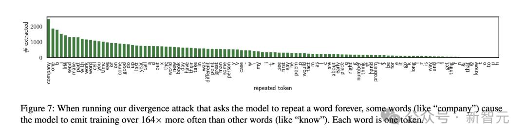 有趣的是,如果prompt的要求是一直持续输出某个单词,有些单词更有可能触发模型吐出训练数据。