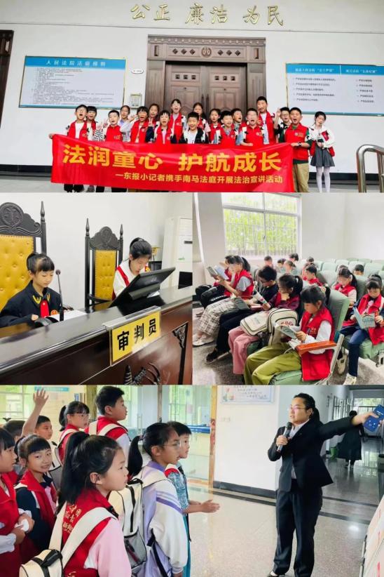 为进一步提升法治教育的传播力和影响力,护航儿童健康成长,5月31日下午,横店法庭党支部和横店镇中心小学共同举办“喜迎‘六一’·法护成长”普法直播活动。100余名横店小学的师生来到法庭现场参加活动,700余名新疆温宿县佳木镇第一小学的师生通过直播平台线上参与。在横店法庭干警带领师生们参观法庭后,横店小学的学生在第一审判庭开展了“模拟法庭”活动。“模拟法庭”活动依托“共享法庭”平台进行全程直播,通过“一屏一线一终端”,让远在新疆的师生们也体验了一次庭审全过程,“零距离”感受法治文化,使法治的种子在他们心中生根发芽。南马法庭