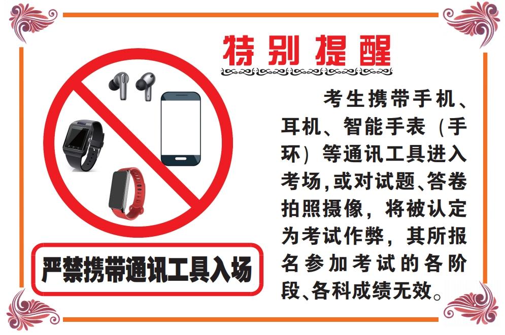 除了必要的文具用品外,其他任何物品不得带进考场。需特别注意的是,手机等通讯工具不得带入考点,请考生在进入考点前交给带队老师和家长,或按照规定要求集中存放。