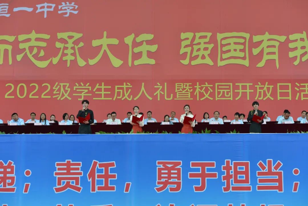 2022级学生成人礼活动于下午5时在学校体育场举行,北京大学河北省招生负责人、邯郸市市长助理刘红燕,原衡水中学副校长康新江,磁县教体局局长赵志强,邯郸恒一中学党委书记、董事长郭红,原衡水中学年级执行校长、邯郸恒一中学校长郝占伟,原衡水中学德育主任、邯郸衡一永华中学执行校长赵保力,原衡水中学地理中心教研室主任、邯郸恒一中学副校长姚美兰,原衡水中学语文研课主任、邯郸恒一中学副校长郭福霞,邯郸恒一中学领导何占军、李海静、马丙飞、徐爱弟、宋东恒,家长代表孟娇女士,邯郸恒一中学九大学科中心教研室主任及原衡中优秀教师代表等出席,特邀邯郸恒一中学学生家长代表张邯英老师主持。