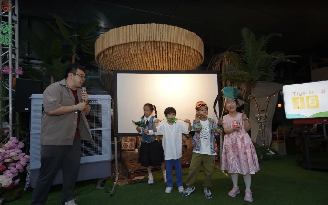 手碟互动表演中,家长和小朋友听着candy老师的节奏来回传球。随着气氛渐浓,大小朋友们纷纷拿起手中的乐器,化身“演奏家”亲密配合,一边唱《加油鸭》一边用手中的三角铁、沙锤、木鱼、铃鼓敲打节奏,沉浸其中。暴走运输赛—纸杯传水环节,小朋友们用嘴巴咬住装满水的纸杯,将水送到舞台对面的水桶里,谁是中华小曲库——猜歌名游戏则是将活动气氛推向了高潮。在一轮紧接着一轮的计分游戏中,孩子们充分发挥勇于拼搏的劲头,在互动中培养起团队合作的意识。