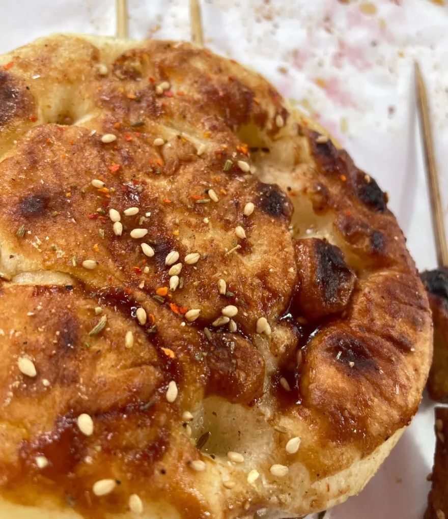 济南烧烤的主食也很有特色,都是烤馒头片、烤烧饼之类的面食——刚出锅的烧饼,酥香里带着椒盐气,一口咬下去,外皮酥脆,内馅松软,是不可多得的满足味道。
