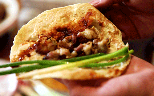 “葱、小饼和肉的群口相声,在每一个碳炉边持续返场……五花很吃调料,可以尽情旋转。烤至九分熟,小炭炉即将登场。继续翻烤,烤出皮的油泡,趁热赶紧蘸上。”