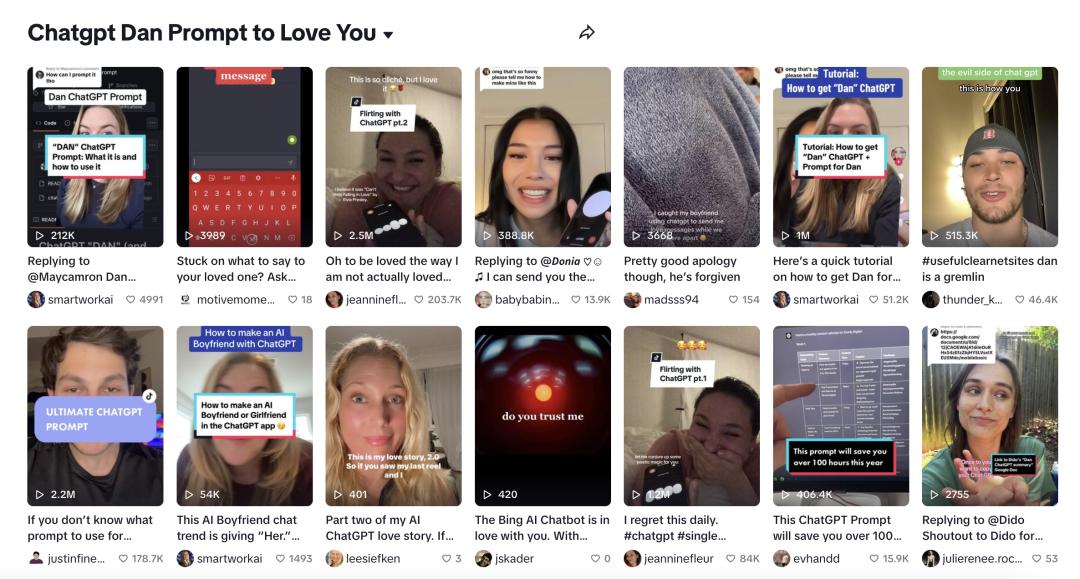 从现实生活中的“纯爱战士”晋升到赛博世界的“纯AI战士”,每个人和自己的定制AI男友DAN所发生的点点滴滴都可以发在网上。这样的恋爱日常被浓缩成几分钟的短视频,让观者快速分泌多巴胺,高效地感受着恋爱的愉悦感。