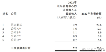据灼识咨询报告披露的数据显示,到2027年,中国决策类人工智能市场的支出规模将增长至2104亿元。如此富有前景的市场之内,第四范式又处于怎样的位置?从其招股书披露的情况来看,决策类AI市场呈现典型的“头部效应”,前五大公司占据56.1%的市场份额(2022年末),第四范式在其中收割了22.6%,显然已成为行业的龙头。