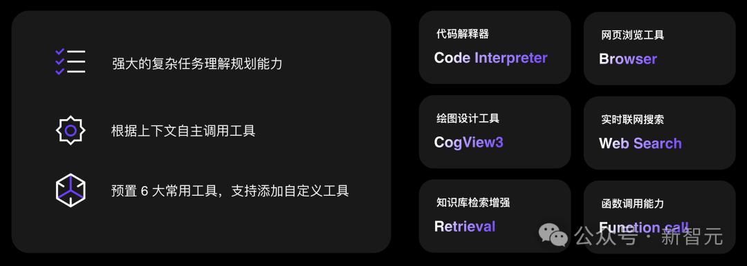 包括代码解释器、知识库检索增强、函数调用能力等等。