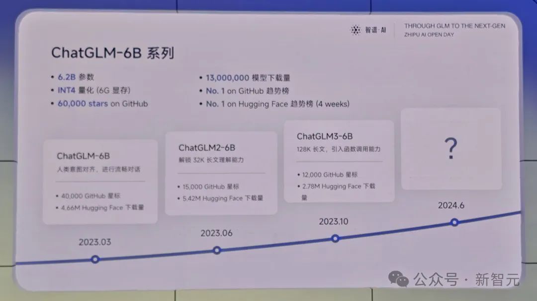 GPT-4发布的同一天,团队首次开源了ChatGLM-6B模型,随后6月开源了二代6B模型,并首次引入GQA、FlashAttention技术,将模型上下文扩充到32K,并加速了生成速度。