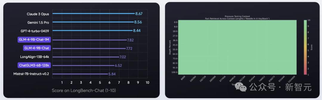 在长度为128K的LongBench-Chat上,GLM-4-9B-Chat模型相比上一代提升了20%。同时,在长度为1M的大海捞针测试中,GLM-4-9B-Chat-1M获得了「全绿」的成绩。