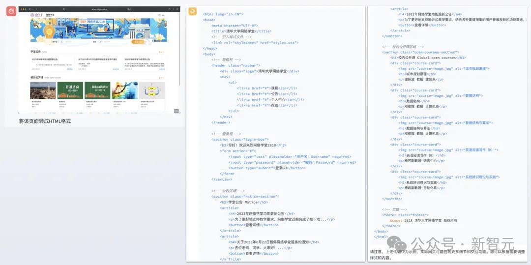 在下面这个例子中,是截取清华大学网络学堂的一个网页截图,并要求模型翻译成HTML代码。