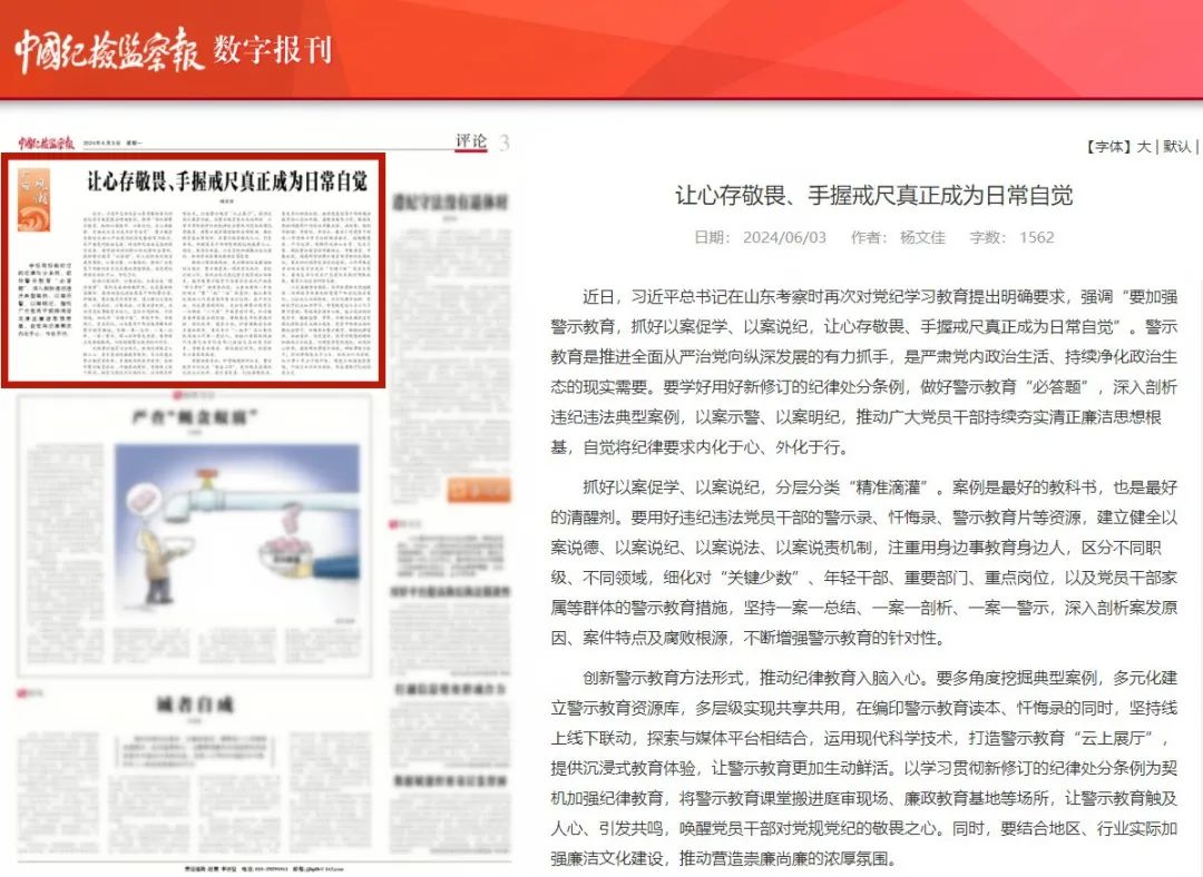 近日,习近平总书记在山东考察时再次对党纪学习教育提出明确要求,强调“要加强警示教育,抓好以案促学、以案说纪,让心存敬畏、手握戒尺真正成为日常自觉”。警示教育是推进全面从严治党向纵深发展的有力抓手,是严肃党内政治生活、持续净化政治生态的现实需要。要学好用好新修订的纪律处分条例,做好警示教育“必答题”,深入剖析违纪违法典型案例,以案示警、以案明纪,推动广大党员干部持续夯实清正廉洁思想根基,自觉将纪律要求内化于心、外化于行。抓好以案促学、以案说纪,分层分类“精准滴灌”。案例是最好的教科书,也是最好的清醒剂。要用好违纪违法党员干部的警示录、忏悔录、警示教育片等资源,建立健全以案说德、以案说纪、以案说法、以案说责机制,注重用身边事教育身边人,区分不同职级、不同领域,细化对“关键少数”、年轻干部、重要部门、重点岗位,以及党员干部家属等群体的警示教育措施,坚持一案一总结、一案一剖析、一案一警示,深入剖析案发原因、案件特点及腐败根源,不断增强警示教育的针对性。
