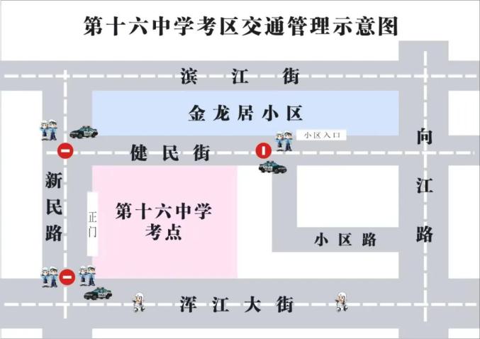 珲春市公安局交巡警大队结合辖区实际,在高考期间对珲春市第一高级中学和珲春市第二高级中学附近主要路段实行临时交通管制措施。