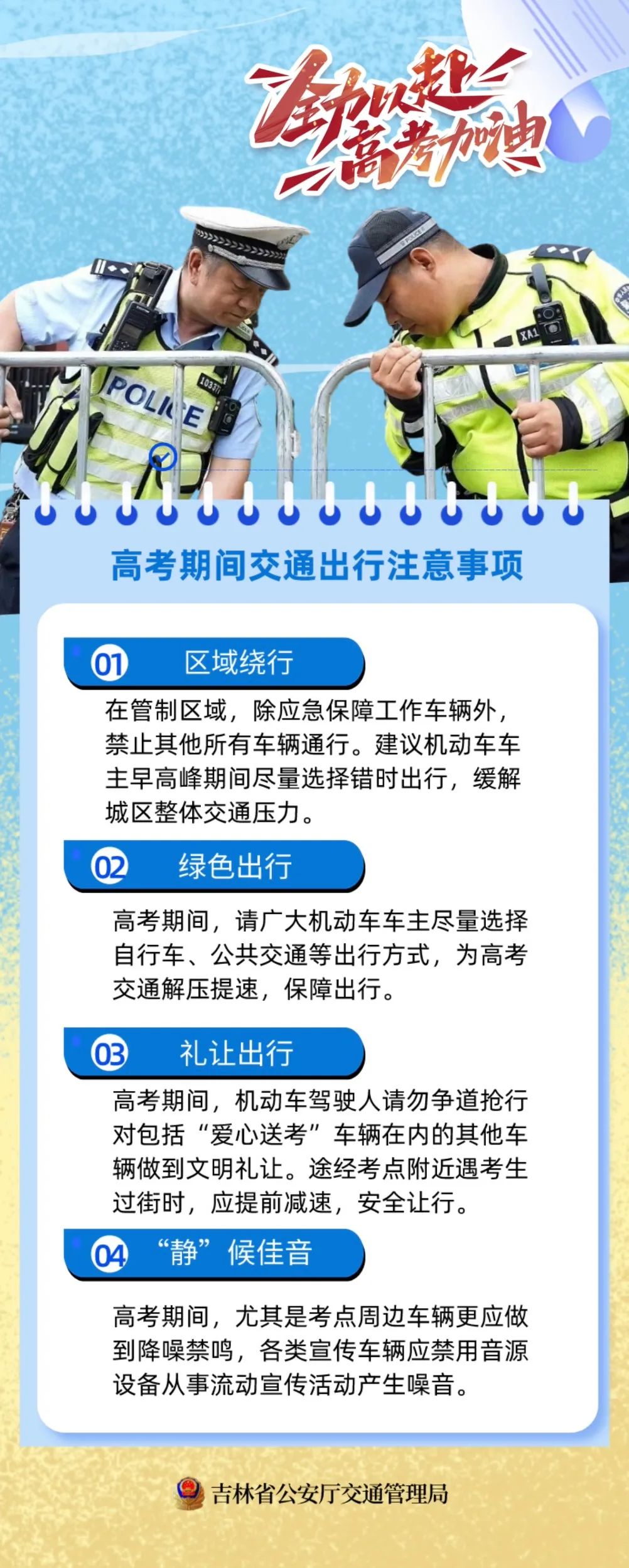 吉林省公安厅交通管理局温馨提示:高考期间,各地将组织机动巡逻警力加强重点区域、路段的巡逻管控,有效缓解市民正常出行与考生赴考“交通流”叠加效应。