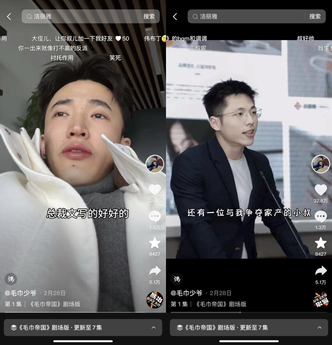 1999年出生的石展承自称毛巾少爷,是洁丽雅集团董事长石磊的儿子,《毛巾帝国》里阴险毒辣的二叔则是洁丽雅集团现任总裁石晶。公开资料显示,洁丽雅的前身是创始于1986年的小型集体企业“诸暨县毛巾厂”,创办人是毛巾大王石昌佳。目前,洁丽雅已发展成为毛巾行业的龙头企业。此前其以358.49亿的品牌价值问鼎2024年中国品牌价值产品品牌榜第一。毛巾少爷将真实的家庭背景、人物关系融入时下走红的霸总爽文,迎合了大众对于豪门家族的好奇和窥私。在短视频中,少爷自称“业绩不突出、腰椎间盘突出”,主要起到“强烈的对比作用”。