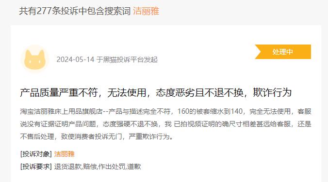 在黑猫投诉上有200多条相关投诉除转型和利润压力之外,洁丽雅本身正面临更严峻的问题。该品牌受假货和品控问题困扰已久,屡次卷入消费者投诉和监管抽查不合格的情况。创始人石昌佳曾在接受央视采访时透露,洁丽雅打假维权的成本差不多要占据其预算的30%到50%。