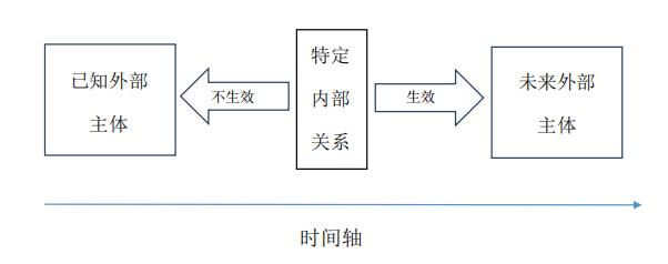 该条件实际包含了两个层面,一是主体应为公司与外部民事主体,二是时间上要求外部关系形成在先,内部关系形成在后。本文针对的是公司组织行为的外部性,故对于公司内部关于出资义务的调整行为是否对公司生效不在讨论范围之内。在时间维度,外部关系形成在先,外部关系主体才能基于公示信息获取信赖保护,也即获得合理预期的前提条件。若外部关系发生于内部关系改变之后,此时内部关系的效力已经外溢,已通过工商登记进行公示并取得对世效力,此后发生的外部关系自然应当受到外溢后的效力所约束。因此,应以内部关系形成之时为锚点,对该时间前与该时间后的对外效力判断标准进行分割。