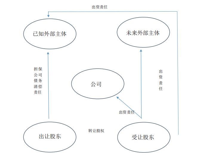 针对延长出资期限和不当减资理解为对已知外部主体不生效尚可接受,毕竟该类内部行为损害已知外部关系利益是显而易见的。从组织法上来看,不应允许内部关系对外产生负向收益。但股权转让后出让人仍需对已知外部主体承担责任,与上文所述司法实践主流观点不一致。认缴出资虽然与股东身份有关联性,但如前所述,认缴出资本身系对公司资产能力的担保,尤其是加速到期全面放开的背景下,股东的出资期限利益对于外部关系而言已经不复存在,股东出资担保公司债务清偿的重要性毋庸置疑。虽然股东有股权转让的自由,其自由性不能突破已知外部主体的外观信赖。换言之,虽然股权转让难以直接评价该内部关系是否对外产生了负向收益,但出资义务的转让直接撼动了已知外部主体在外部关系发生时对于出让股东出资的可期待利益,而受让股东的出资能力对于已知外部主体而言完全是未知数,该情形足以让外部关系主体陷入公司是否仍对外具有清偿能力的不安,是为股权转让对已知外部主体产生的负向收益。至于股东身份的变化,原则上可以认定出资义务在内部关系中已经转移,但出让股东系基于原股东身份向已知外部主体承担了担保公司债务清偿之责任,并非是法律意义上的出资责任,其在承担责任后可以向受让股东予以追偿。而受让股东是当然的出资义务人,其受让股权的行为视为对已知外部关系进行债的加入,出让股东与受让股东分别在各自认缴金额范围内承担出资加速到期责任。具体关系如下图。