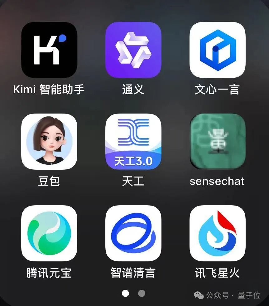 Kimi、通义千问、文心一言、豆包、讯飞星火、商量、智谱AI、腾讯元宝、天工。