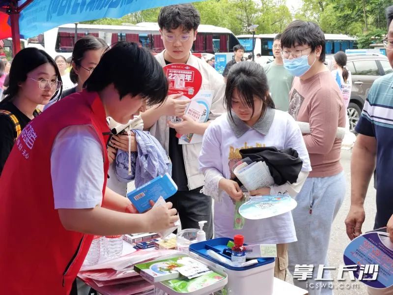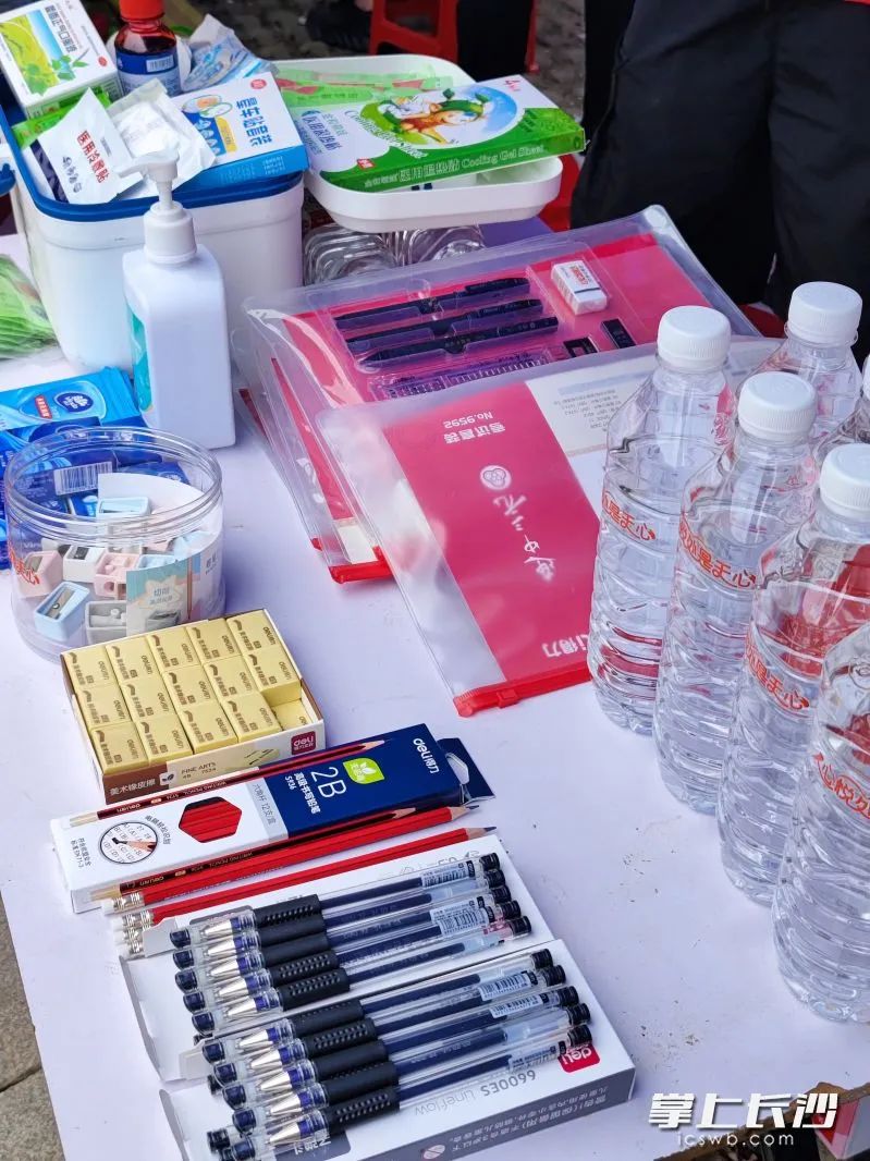 “爱心护考服务驿站”免费为考生和家长提供饮用水、充饥食物、急救药品和考试用具等物品。“今天上午,有个学生临考前文具袋突然不见了,急得直打转。送考老师立马来我们这里领了一份全新的文具袋,迅速稳住了考生的情绪。”天心区青年志愿者协会秘书长刘明珠说。