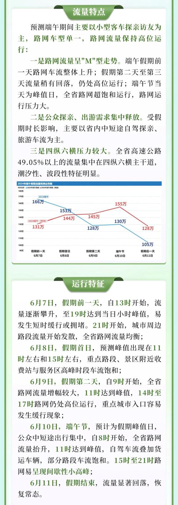 端午节假期来临,民俗活动增多,群众外出旅游、返乡探亲出行集中,又适逢全国高考,同时全国多地还可能有雨,道路交通安全风险加大。假期峰值流量将达155万辆,预计出现在6月10日端午节当天。
